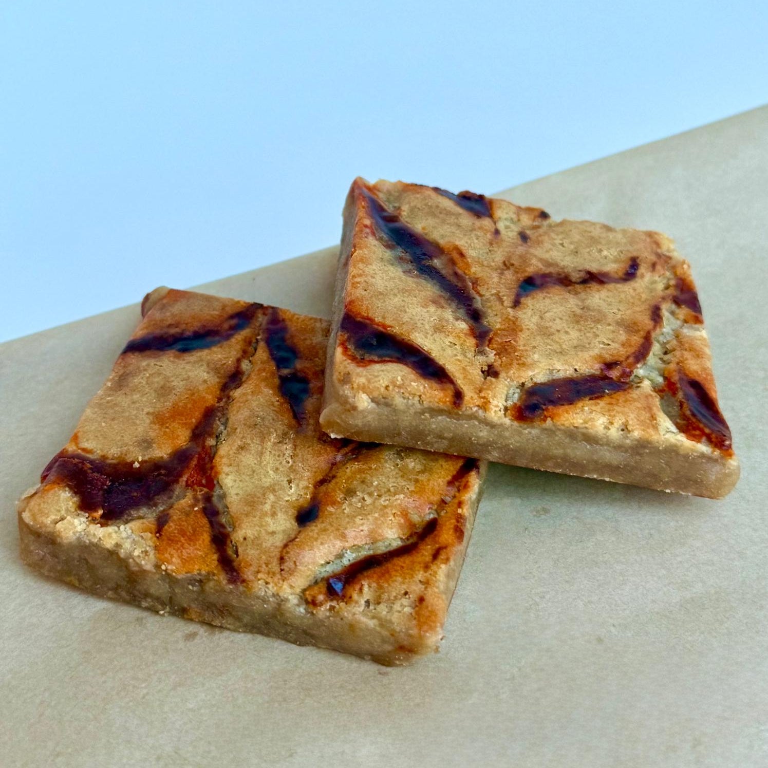 Witte chocolade blondie met chai & speculaas spices. En een swirl van harissa